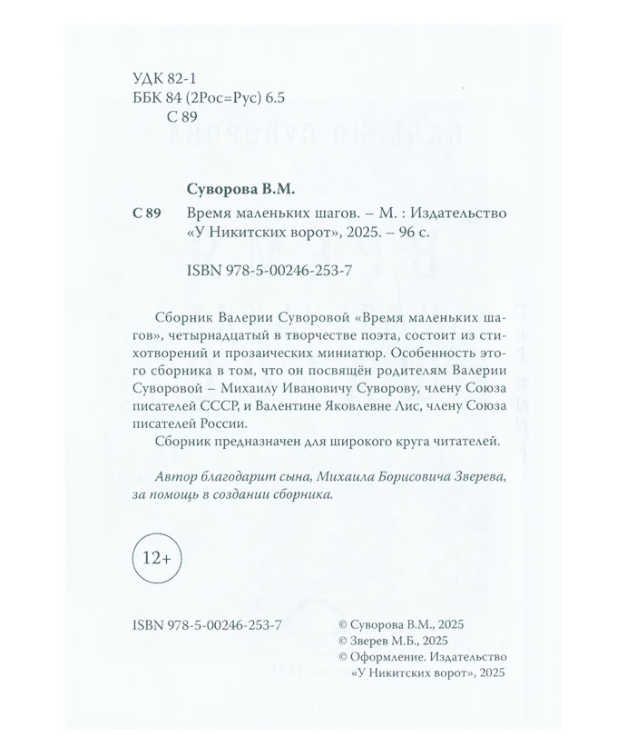 Суворова В.М. Время маленьких шагов : сб. стихотворений и прозаических миниатюр / Валерия Михайловна Суворова. - Москва : У Никитских ворот, 2025. - 92, [3] с., [5] л. ил., портр. You must have JavaScript enabled to use this form. Эту книгу вы можете найти в отделах Краеведческий информационный центр 2026 Художественная литература. Детская литература