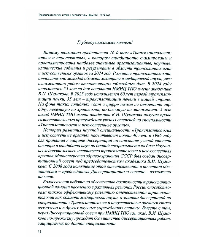 Трансплантология: итоги и перспективы Т. 16: 2024 год / М-во здравоохранения и соц. развития РФ, Федер. науч. центр трансплантологии и искусств. органов им. акад. В. И. Шумакова, Минздравсоцразвития России, Общерос. обществ. орг. трансплантологов «Рос. трансплантол. о-во» ; под ред. С.В. Готье. - Москва ; Тверь : Триада, 2025. – 470 с. : цв. ил., портр., табл.