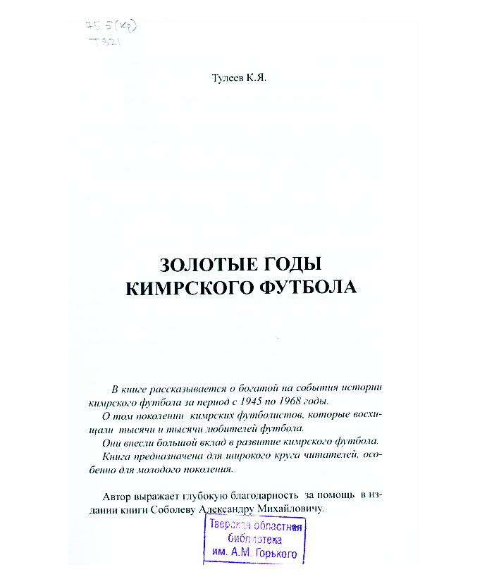 Тулеев К.Я. Золотые годы Кимрского футбола : история кимрского футбола за период с 1945 по 1968 годы / Константин Яковлевич Тулеев. - Москва : Воронцов М.Ю., 2025. – 273 с. : ил., портр., табл. You must have JavaScript enabled to use this form. Эту книгу вы можете найти в отделах Краеведческий информационный центр 2026 Медицина. Спорт. Туризм