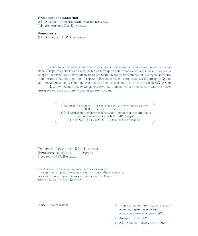 Тверь, тверская земля и сопредельные территории в эпоху средневековья = Tver, Tver Region and neighbour territories in the Middle Ages : материалы науч. семинара. Вып. 17 / Твер. науч.-исслед. ист.-археол. и реставрац. центр ; редкол.: А.Н. Хохлов (отв. ред.), Т.Н. Артемичева, С.А. Кунгурцева. - Тверь : Парето-Принт, 2025. - 461 c. : ил.