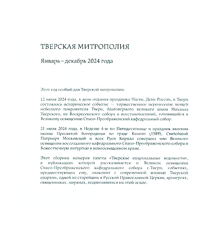 Тверская митрополия. Январь - декабрь 2024 года : [сб. номеров с 1 по 12 газеты «Тверские епархиальные ведомости»] / Русская Православная Церковь, Тверская митрополия . - Тверь : [б. и.], 2025. - 144 с. : ил. You must have JavaScript enabled to use this form. Эту книгу вы можете найти в отделах Краеведческий информационный центр 2026 Философия. Психология. Религия