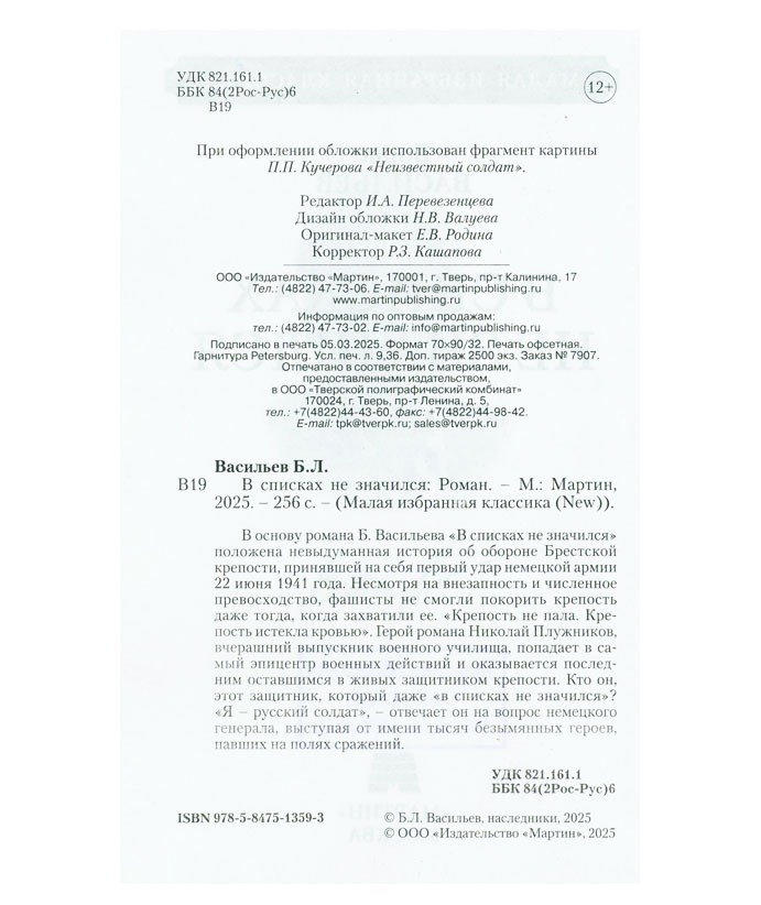 Васильев Б.Л. В списках не значился : роман / Борис Львович Васильев. – Москва : Мартин, 2025. – 256 с. – (Малая избранная классика. New). You must have JavaScript enabled to use this form. Эту книгу вы можете найти в отделах Краеведческий информационный центр 2026 Художественная литература. Детская литература