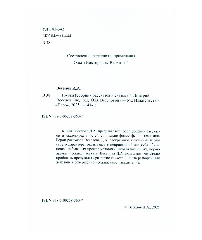 Веселов Д.А. Трубка : (сборник рассказов и сказок) / Дмитрий Александрович Веселов ; сост., ред. и примеч. Ольги Викторовны Веселовой. - Москва : Перо, 2025. - 411, [1] с. Эту книгу вы можете найти в отделах Краеведческий информационный центр 2026 Художественная литература. Детская литература
