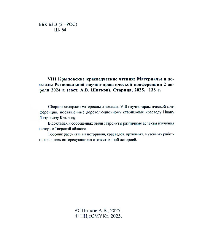 VIII Крыловские краеведческие чтения : материалы и доклады Региональной научно-практической конференции 2 апреля 2024 г. / ГБУК ТО «Тверской государственный объединенный музей», Старицкий клуб «Краевед»; сост. А. В. Шитков. - Старица : Голубева М. А., 2025. - 193, [2] с. : ил., цв. ил., портр., факс.