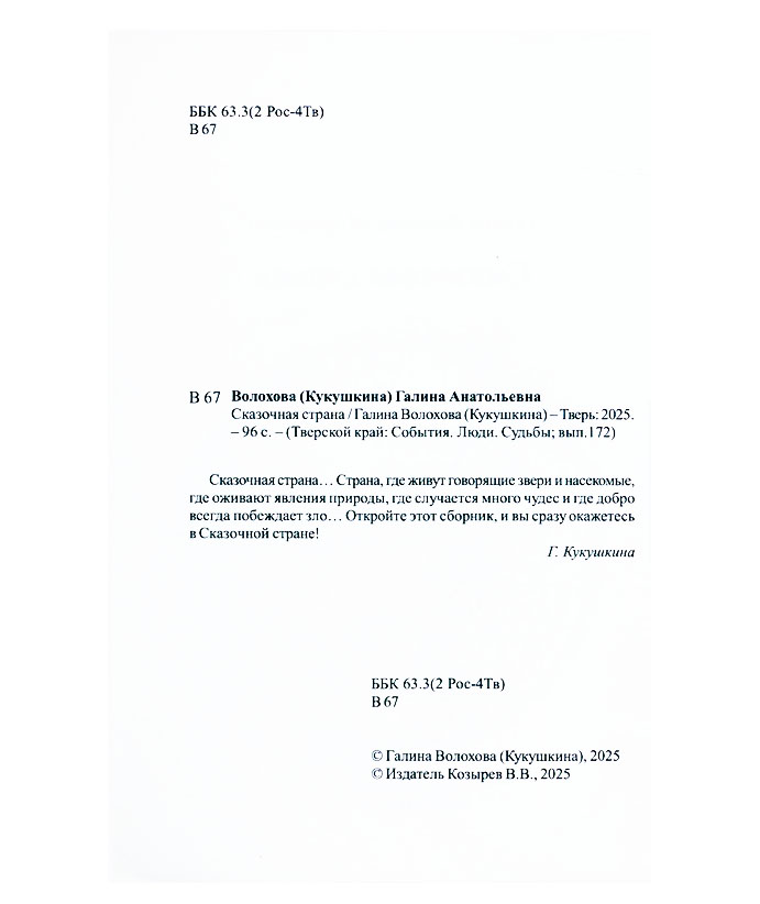 Волохова Г.А. Сказочная страна / Галина Анатольевна Волохова (Кукушкина). - Тверь : Издатель Козырев В.В., 2025. - 95 с.: ил. - (Тверской край: События. Люди. Судьбы : краевед. альм. / ред. В. В. Козырев ; вып. 172).