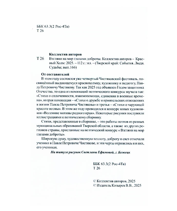 Взгляни на мир глазами доброты : IV Чистяковский фестиваль : Межмуниципальный поэтический конкурс / Бекренская сельская библиотека. - Красный Холм : Издатель Козырев В. В., 2025. - 111 с. : ил. - (Тверской край : События. Люди. Судьбы : краеведческий альманах / ред.: В. В. Козырев ; вып. 166). - Содерж. разд.: Номинация «Стихи о сплочённости, взаимопомощи, единении в военные времена»; Номинация «Стихи о дружбе и приятельских отношениях в жизни Павла Петровича Чистякова»; Номинация «Стихи о чарующей красоте весны».