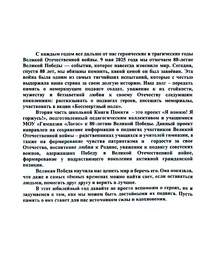Я помню! Я горжусь! Судьба моей семьи в годы Великой Отечественной войны : [сб.] / МОУ «Гимназия "Логос"» (Кимры). - Кимры : [б. и.], 2025. - 83 с. : фот., факс. Эту книгу вы можете найти в отделах Краеведческий информационный центр 2026 История