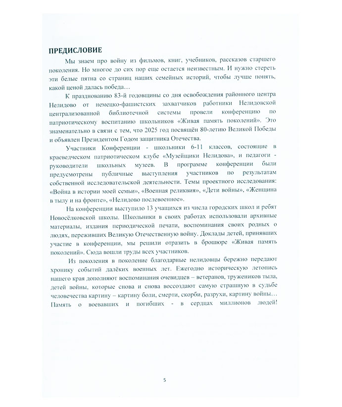 Живая память поколений : материалы муницип. краевед. конф., посвящ. 83-й годовщине со дня освобождения район. центра Нелидово от немецко- фашистских захватчиков / Нелидов. централиз. библ. система, Отд. краевед. работы ; сост. О. В. Горюнова. - Нелидово : [б. и.], 2025. - 24 с.: цв. ил., портр., факс.